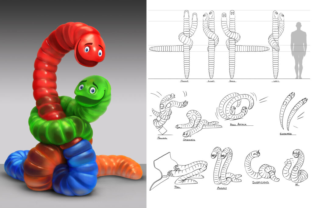 Guests on Reese’s Cupfusion, Hersheypark’s first story-based interactive dark ride, are tasked with protecting the Reese’s Central factory from a dysfunctional band of disgruntled candy interlopers, the League of Misfit Candy. Slither n Squirm are the mischief-making League’s “double act”, a pair of gummy worms who are stuck on one another—literally. For anyone wondering, Slither is the one with the blue tail. (We think.)